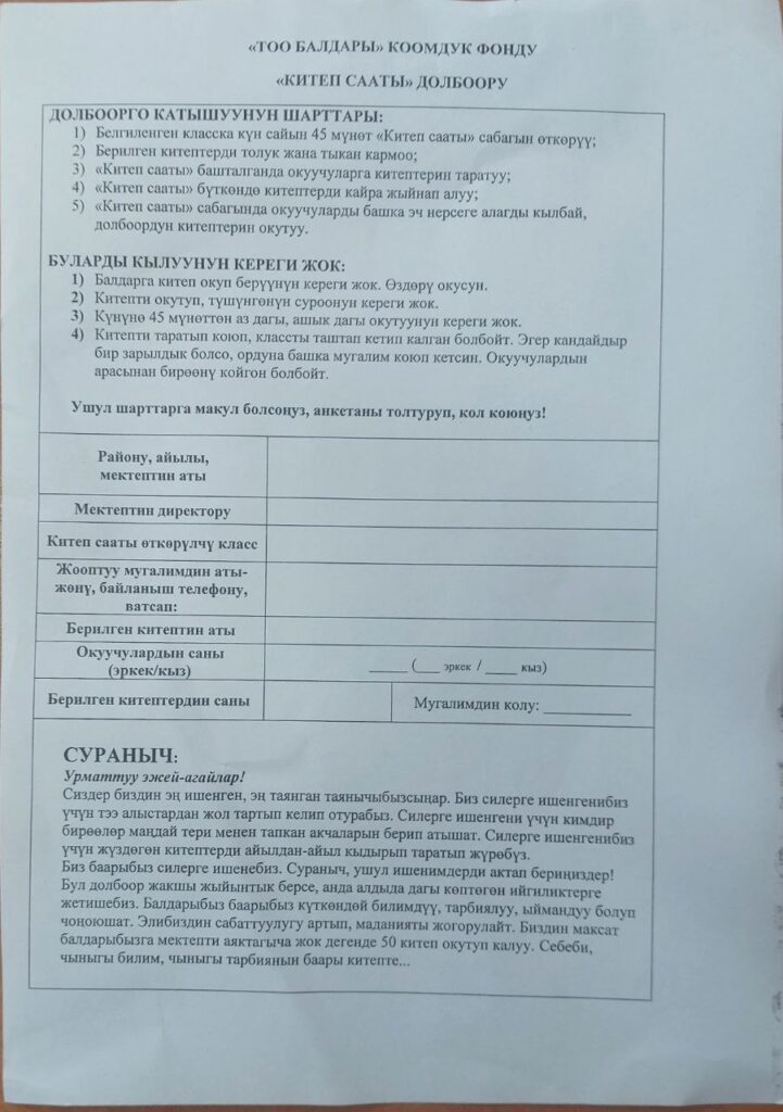 Кенже класстардын китеп окуу адатын калыптандыруу; окуучулардын билим деңгээлин көтөрүү; Кыргызстанды көп окуган өлкөлөрдүн катарына кошуу; адабий китептер аркылуу кыргыз тилинин кадыр-баркын көтөрүү максатын көздөгөн “Китеп сааты” долбору 2019-2020-жылдагы пандемияга чейин Кочкор жана Ат-Башы райондорунда ийгиликтүү пилоттук сыноодон өткөн.